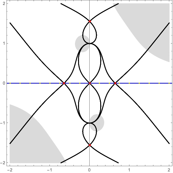 with \(\alpha\) the strength of the lens. The numerical Picard-Lefschetz scheme can be used to flow the original integration domain \(\mathbb{R}\) to the Lefschetz thimble \(\mathcal{J}\). See Fig. 3 for flow to the Lefschetz thimble for the lens strength \(\alpha =2\) at the centre of the lens \(\mu=0\). In this configuration, only the three real saddle points corresponding to three real geometric images are relevant to the integral.