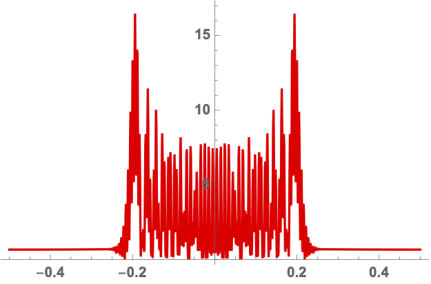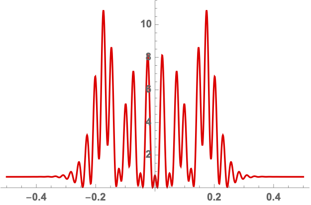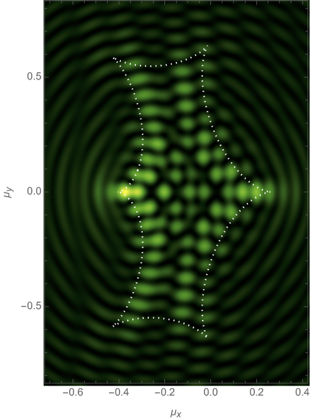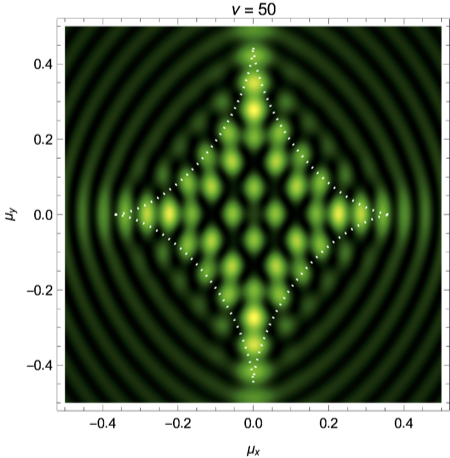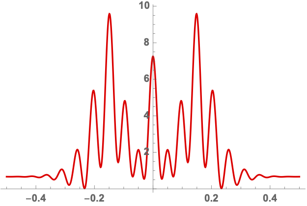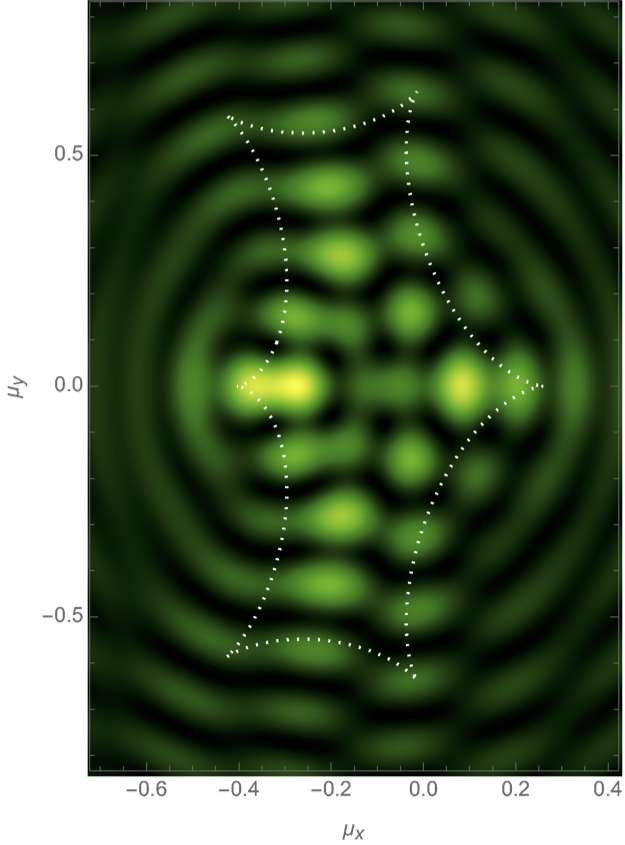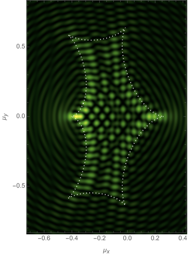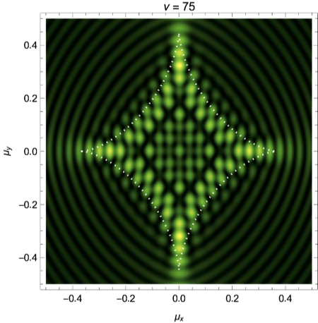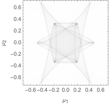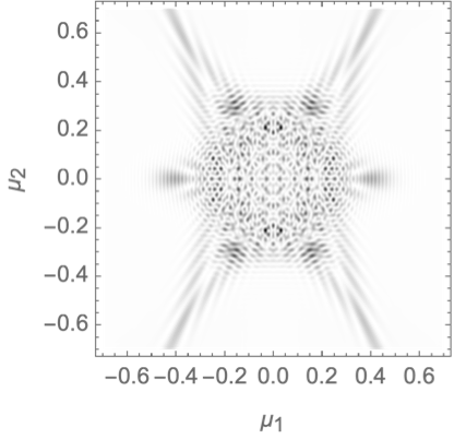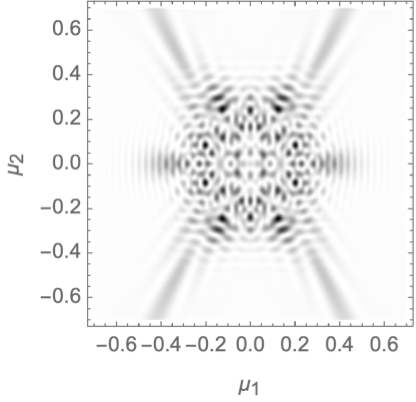We will evaluate the interference pattern for a situation in which the two souces are separated by the Einstein radius \(\boldsymbol{r} = (0,1/2)\) and the left source is twice as heavy as the right source, \(f_1=1/3\) and \(f_2=2/3\). See Fig. 7 for the geometric optics prediction and the interference patterns for the frequencies \(\nu=25, 50\) and \(75\). For more details see Feldbrugge, and Turok (2020).