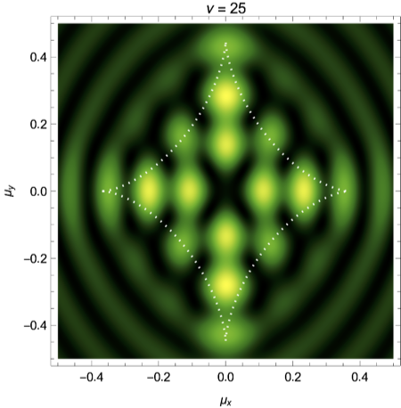 with \(\boldsymbol{x}=(x,y)\) and the strength of the shear \(0\leq \gamma \leq 1\). The corresponding intensity pattern for a mild shear \(\gamma=0.2\) for the frequencies \(\nu=25,50,75\) is illustrated in Fig. 6. For details see Feldbrugge, and Turok (2020).